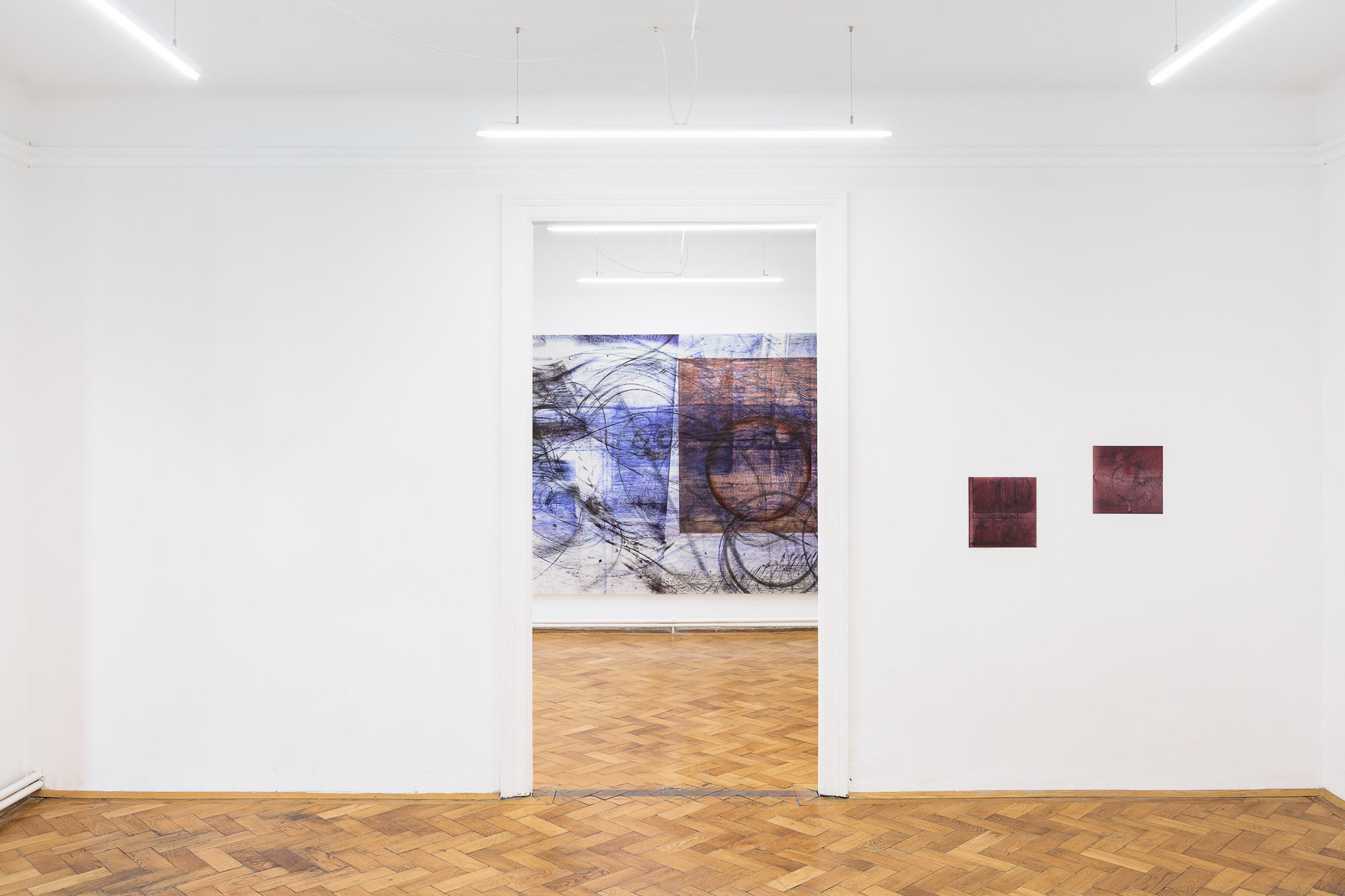 Im Gehen falle ich und fange mich, in rhythmischer Abfolge. Eine kontinuierliche Bewe- gung in die Ungewissheit in überschaubaren Sequenzen. Malen im Gehen, dachte ich. Ich gehe und ziehe einen Besen mit Tusche getränkt neben mir her. Schon bin ich am Ende des Blattes. 9 m in 9 sec. Das Format des Bildes so angelegt, dass es zu breit war für mein Studio in E Williamsburg, auch für alle nachfolgenden Arbeitsorte. Überblickslosigkeit, oder das Vertrauen üben in das Nichtsehen des Vorher und Nacher, aus der Erinnerung weiterden- ken. Also in Segmenten gearbeitet, in vielen Schichten, Teile eingefaltet, ausgefaltet, einge- packt, transportiert, wieder aufgefaltet, aufgeführt in Upstate NY für mein letztes Crit at Bard, dann im Reisegepäck nach München, es liegt da nur eine Weile, einmal schaue ich Teile an und weiß nicht weiter, nach Köln ins Atelierhaus der Südstadt, hier die Frottage der großen Tischplatte, Kreise um Teller. AiR. Die größeren Ringe auf den Bildern sind Plät- ze der Ruhe, gesetzt von oben auf das Papier, eine Entscheidung. Von dort aus kann ich mich neu orientieren in alle Richtungen, sie werden Drehscheiben. Nach Wien in die Unte- re Augartenstraße, Fischgrätparkett. Für die Ausstellung schneide ich das fertige Bild in zwei Teile.