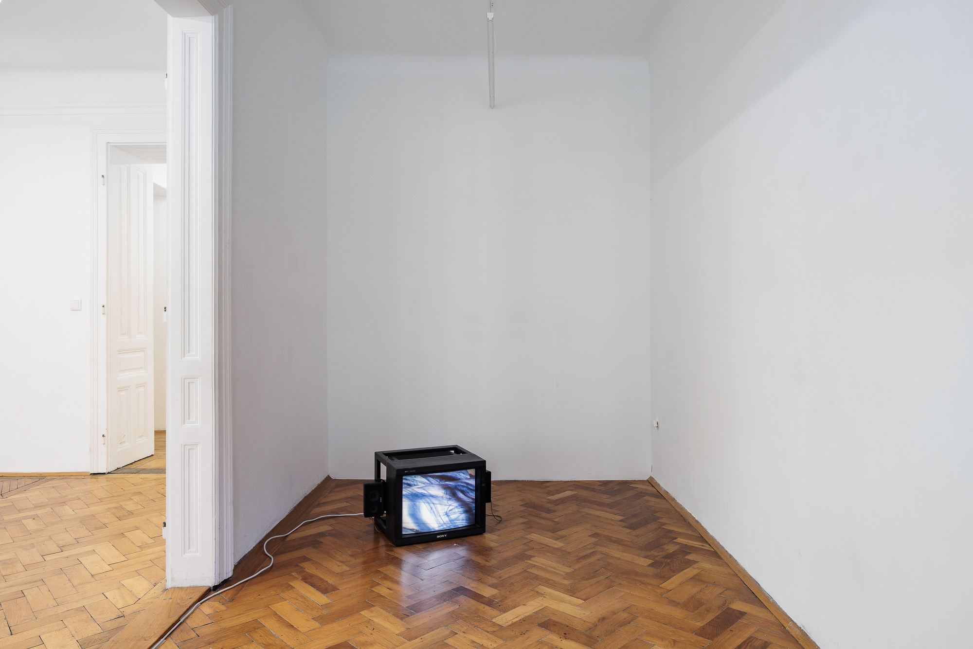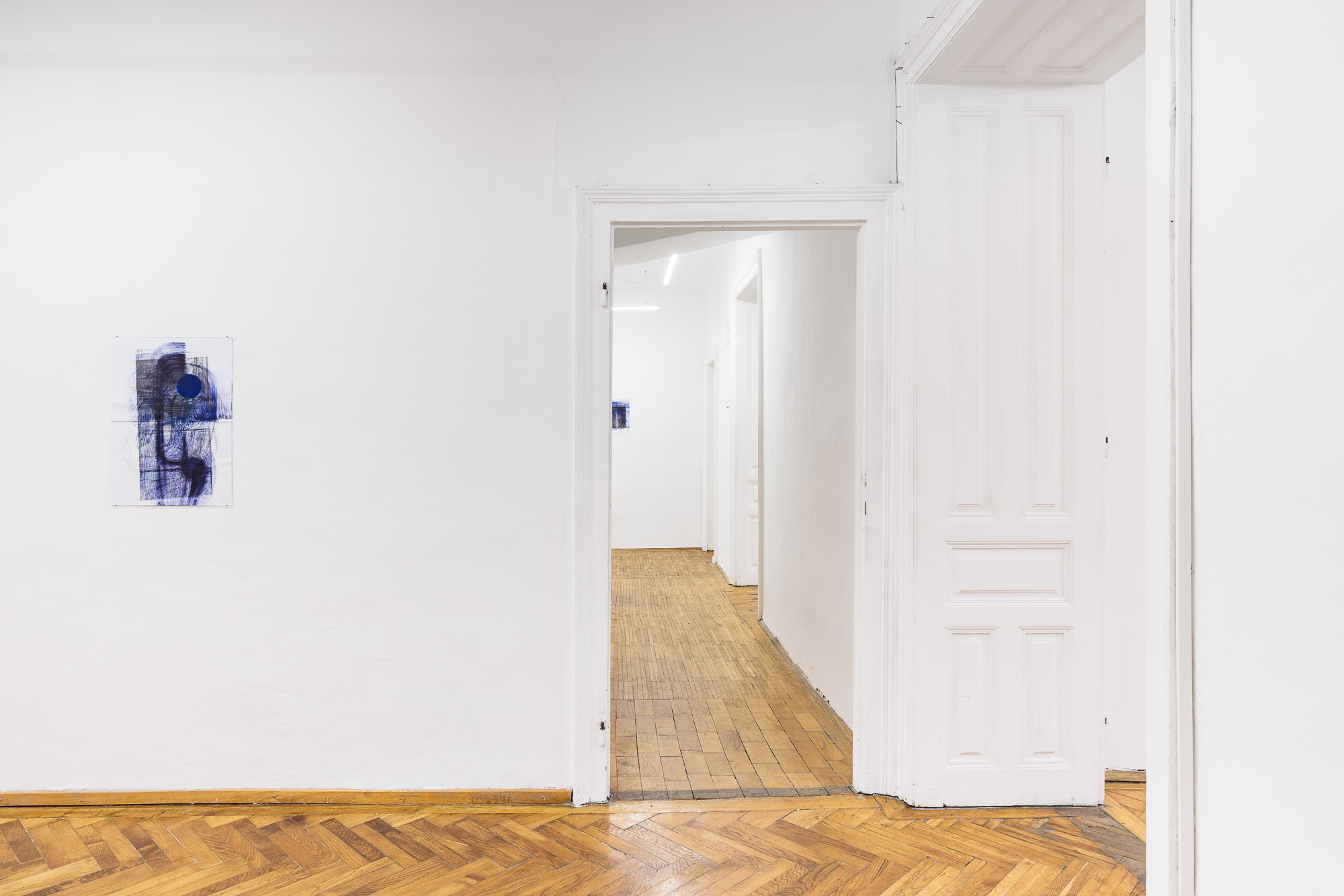 Fluss und Widerstand sind ein Begriffspaar, das ich seit einigen Monaten mit mir herumtra- ge. Vielleicht seit unserer Ruine-Recherche zum Donaukraftwerk Jochenstein. Sicher auch wegen den „Zeiten wie diesen“, in denen wir leben. Verankerung und Leitung der fliegen- den Bewegungen über die Widerstände auf oder unter dem Papier, von den Schwellen zwi- schen den Räumen, verengt durch die Türausschnitte. Wie Fluss und Widerstand produktiv werden können, wie im Kraftwerk. Widerstand auch als ästhetisches Problem. Ich lege Pa- pier durch die ersten drei Räume der Unteren Augartenstraße 26/27, durch zwei Türaus- schnitte hindurch.
